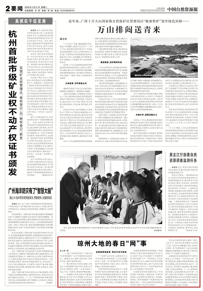 自然资源保护更加坚实有力。“机器管耕地”推动全省耕地保有量、永久基本农田保护面积超额完成国家任务,实现数量稳中有增;“机器管督察”对耕地、自然岸线、红树林等重点区域常态化监测、闭环处置,早发现、早制止、早处置能力显著增强。