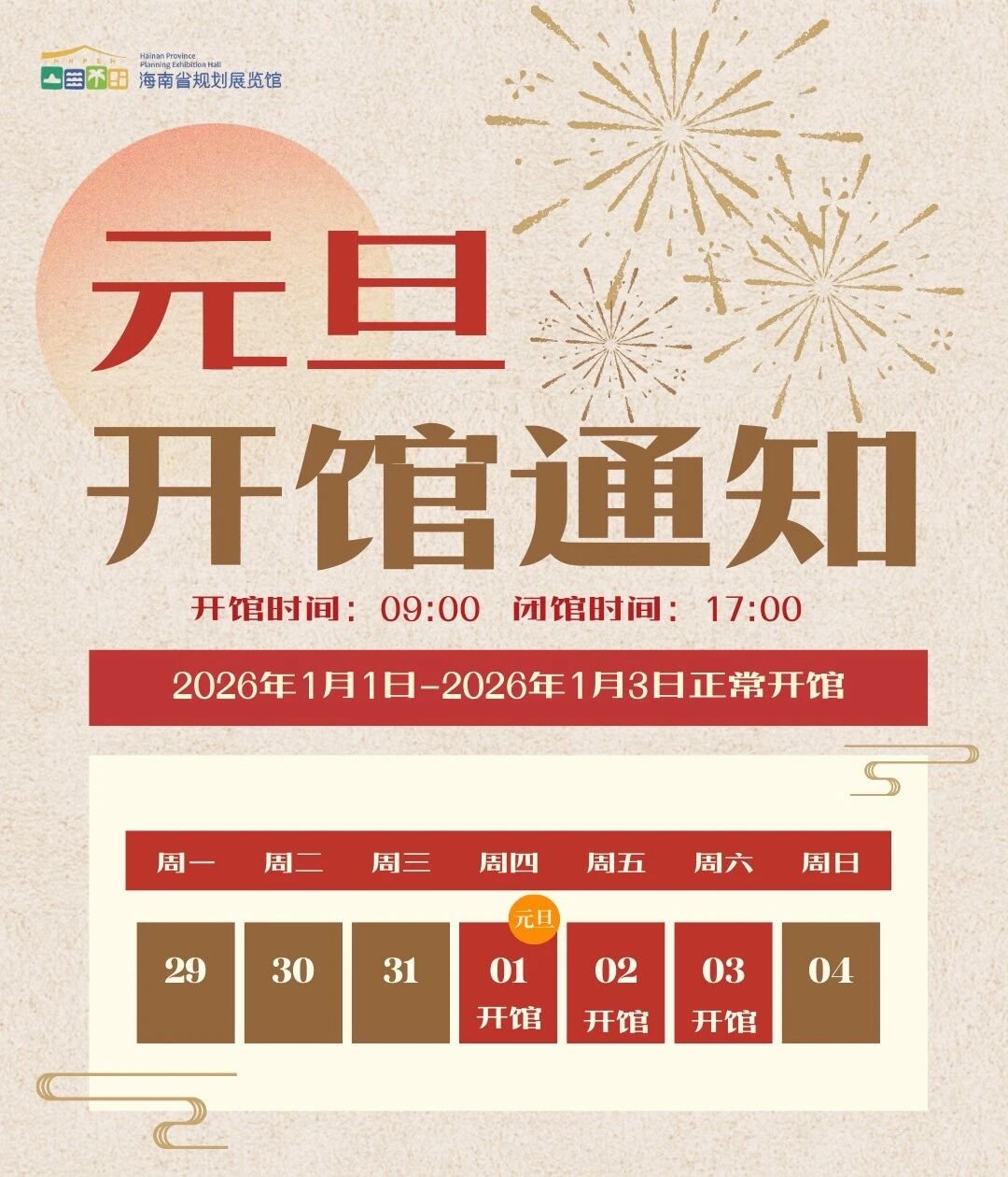 @各位市民、游客 2026年元旦假期即将到来 元旦假期 海南省规划展览馆正常开放 欢迎广大市民、游客前来参观~ 来源 | 海南省规划展览馆 编辑 |陈国智 审核 | 苏军 邢代洪 胡亚利...
