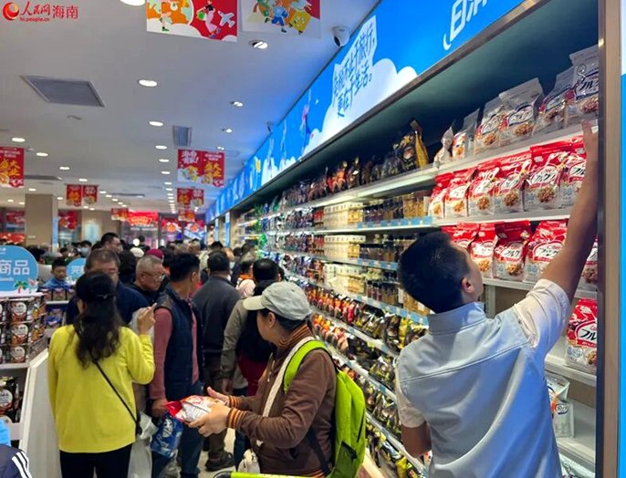 2月11日,海南首批5家日用消费品免税店开业,市民在家门口选购免税商品。人民网记者 李学山摄